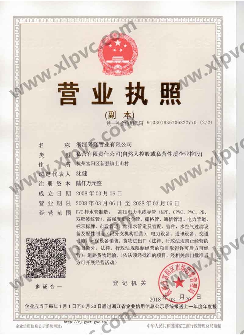 浙江興隆管業(yè)有限公司位于杭州市富陽區(qū)(杭州第九新區(qū)),坐落在新登鎮(zhèn),相距杭州僅60公里,水、陸、空交通運輸十分便利。浙江興隆管業(yè)有限公司前身為富陽興隆塑料制品廠,成立于1992年,2008年改名浙江興隆管業(yè)有限公司,數(shù)十年來,公司一直至力于管道的生產(chǎn),目前公司擁有國內(nèi)先進(jìn)的CPVC保護(hù)管生產(chǎn)線,HPVC()雙壁波紋管生產(chǎn)線,多孔管生產(chǎn)線,玻璃鋼電纜保護(hù)管生產(chǎn)線、MPP電纜保護(hù)管生產(chǎn)線。生產(chǎn)的主要產(chǎn)品有:CPVC電纜保護(hù)管、MPP電力電纜保護(hù)管(頂管)、高強(qiáng)度塑合金管、HDPE給排水管、HPVC()雙壁波紋管、玻璃鋼電纜保護(hù)管、埋地通信用的PVC-U多孔管、PE直壁管、PVC-U雙壁波紋管、梅花管等,年生產(chǎn)能力達(dá)20000萬米。